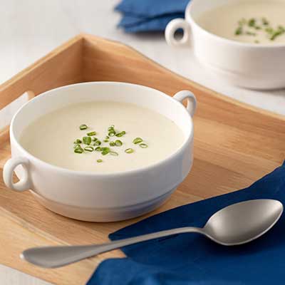 Zwiebel und Knoblauch in einer Pfanne in Olivenöl anbraten, das Mehl hinzufügen und gut umrühren. Die Milch auf einmal hinzufügen und rühren, bis sie dickflüssig ist. Den bereits gekochten Blumenkohl hinzufügen und mit Salz und Pfeffer würzen. In einem Mixer die Mischung mit OPTIFIBRE® zu einer homogenen Creme schlagen. Mit grünen Zwiebeln heiß bestreut servieren.